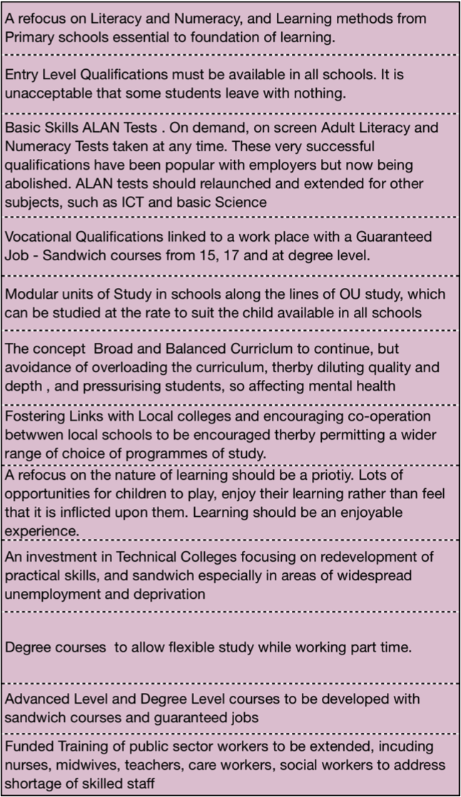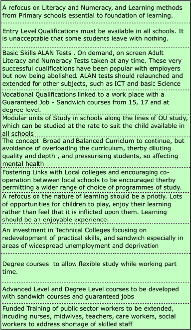 Labour needs to implement a revolutionary restructuring of the qualification pathway. There should be a range of different types of qualifications from which to choose, according to the needs of learners, and at a pace which suits learners. A qualification which motivates the learner, and results in real skill acquisition and into employment. Furthermore the qualification network should continue to be available as a right to all citizens throughout their lives. On-line learning, apprenticeships, sandwich courses leading to guaranteed employment, Open University degrees should all be part of an inclusive life-long education experience.