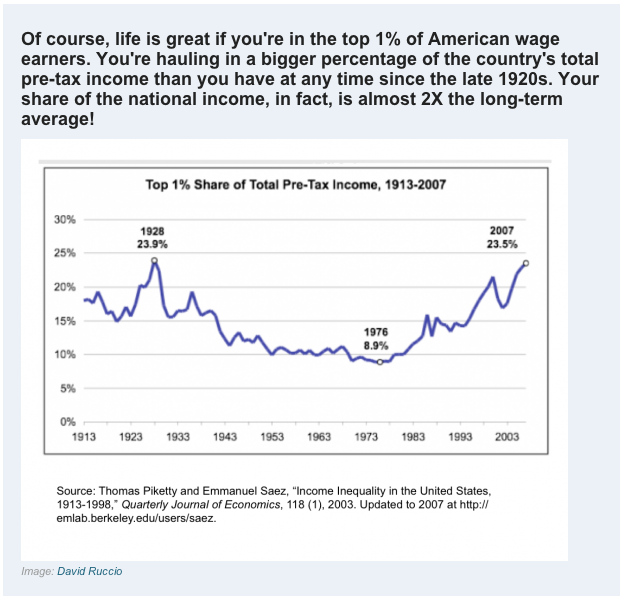 ‘In fact, (the Citigroup report) said, America was composed of two distinct groups: the rich and the rest. And for the purposes of investment decisions, the second group didn’t matter; tracking its spending habits or worrying over its savings rate was a waste of time. All the action in the American economy was at the top: the richest 1 percent of households earned as much each year as the bottom 60 percent put together; they possessed as much wealth as the bottom 90 percent; and with each passing year, a greater share of the nation’s treasure was flowing through their hands and into their pockets. It was this segment of the population, almost exclusively, that held the key to future growth and future returns. The analysts, Ajay Kapur, Niall Macleod, and Narendra Singh, had coined a term for this state of affairs: plutonomy.’ (7)