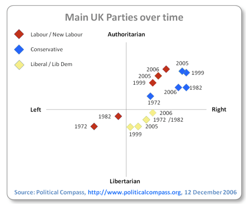 This consensus is shown clearly in a political compass graph which charts the relative positions of each mainstream party since 1972. Particularly noticeable is the increase in authoritarianism and the rightward shift of the LP under the New Labour leadership, such that by 1997, it occupied more or less the same space as the Conservatives.