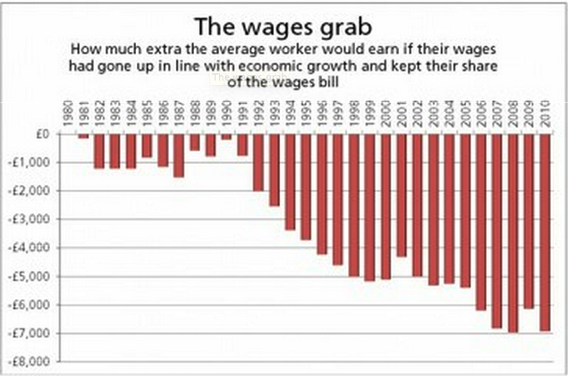 The great Graph produced by the TUC shows how much the average worker has lost because wages have not kept up with growth over the last thirty years… the last thirty years being the years of TINA, Mrs Thatcher’s ‘There is no alternative’.