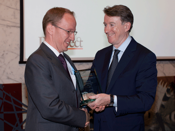 Peter Mandelson presents the Global Think Tank of the Year Award to Guntram Wolff, the deputy director of Bruegel.
