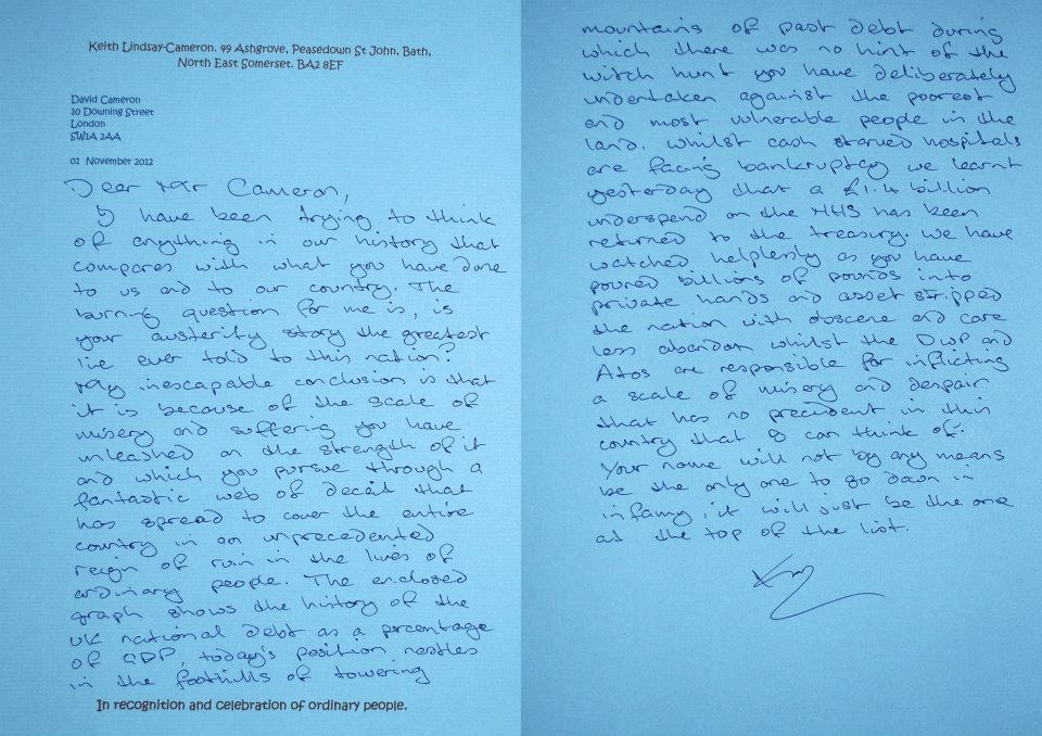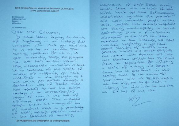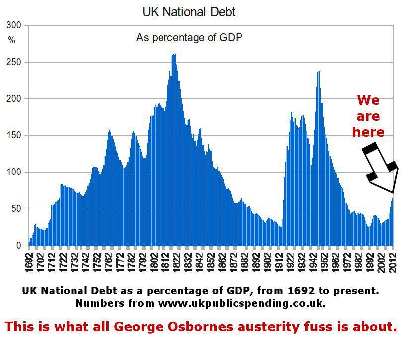 The enclosed graph shows the history of the UK national debt as a percentage of GDP, today’s position nestles in the foothills of towering mountains of past debt during which there was no hint of the witch hunt you have deliberately undertaken against the poorest and most vulnerable people in the land. Whilst cash starved hospitals are facing bankruptcy we learnt yesterday that a £1.4 billion underspend on the NHS has been returned to the treasury. We have watched helplessly as you have poured billions of pounds into private hands and asset stripped the nation with obscene and care less abandon whilst the DWP and Atos are responsible for inflicting a scale of misery and despair that has no precedent in this country that I can think of. Your name will not by any means be the only one to go down in infamy, it will just be the one at the top of the list.