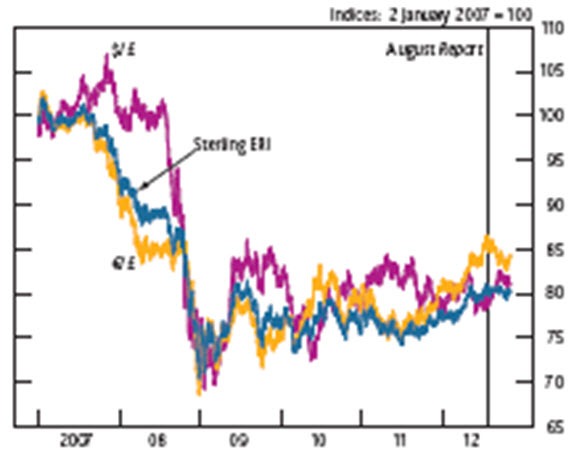 A number of commentators have recently called for a currency devaluation as a way to revive the British economy and outgoing bank of England Governor Mervyn King has described a recent very modest rise in the value of Sterling as ‘unwelcome’.These calls tend to ignore the fact that Britain has already had very substantial devaluation. As the Bank of England chart shown in Fig. 1 below shows the decline in the pound’s exchange rate index (ERI) from 2008 onwards. The ERI fall was nearly 30%, with a slightly larger fall against the US Dollar and a less pronounced fall versus the Euro. The recovery in the currency’s exchange rate has only been a partial one.