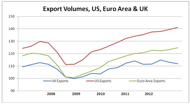 This is a remarkably bad performance given that world trade has expanded since the recession of 2008 to 2009, according to the World Trade Organisation, by 13.8% in 2010 and by 5% in 2011. It is also a remarkably poor performance even compared to sluggish major trading partners. Fig. 3 below shows export volumes compared to both the US and the Euro Area. Euro Area export volumes are now 3.6% above their pre-recession peak while US exports have increased by 8.3%.