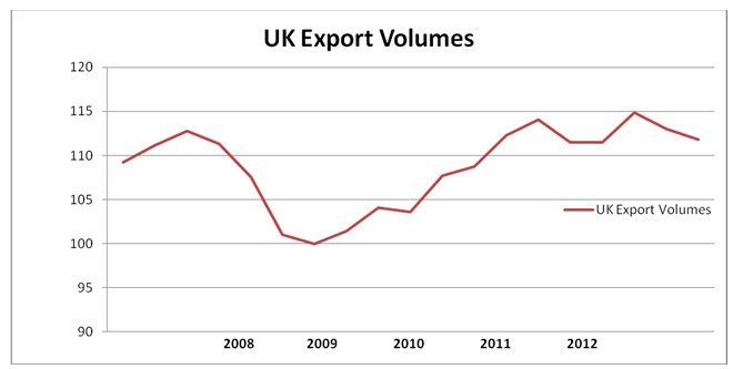 From their pre-recession peak exports fell by 11.3% to their low-point. They have since recovered but were still 0.8% below that peak in the 2nd quarter of 2012. Since George Osborne announced the ‘march of the makers’ as the theme of his first budget in 2010 export volumes have actually fallen by 0.4%. This is possibly the only time in British history where there has been a very substantial currency depreciation and no recorded improvement in export performance.