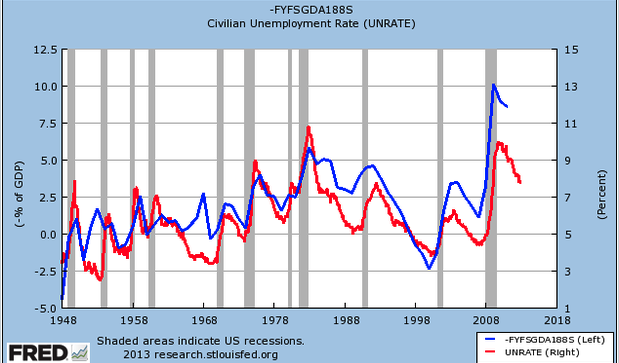 (Note: The blue line shows the surplus-or-deficit-as-share-of-GDP inverted, and the red line shows the unemployment rate).