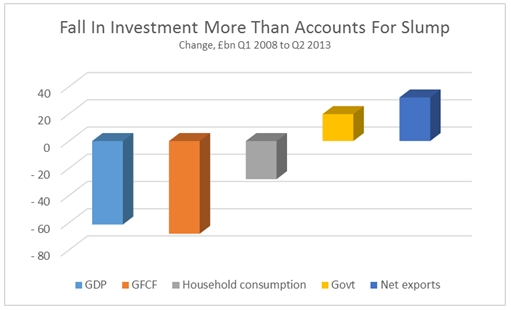 The economy is still £61bn below the peak level. Yet it remains the case that the fall in investment more than accounts for the entirety of the recession, as shown in Fig. 1. Investment (Gross Fixed Capital Formation) has fallen by £68bn. The other main component of GDP which has contracted is household consumption, which is down by £28bn. This demonstrates the effects of falling real wages on living standards. It effectively accounts for half the recession, but it is not as severe as the decline in investment.