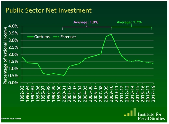 The Tory-led government has no intention of increasing investment. The much-hyped infrastructure investment plan was entirely fake. As the chart from the Institute for Fiscal Studies reproduced below shows, government investment is being cut.