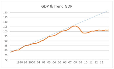 Previously, ONS data had shown that six years into economic slump the economy was still 2.6% below its pre-recession peak in the 1stquarter of 2008. Now it shows that the economy is actually 3.9% below its peak.