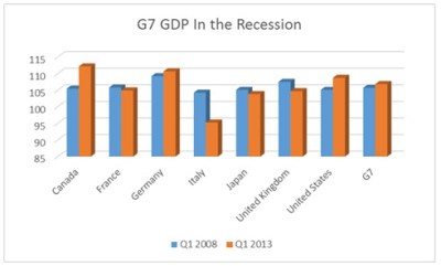 In fact the British economy has been one of the worst performers in the G7, which itself has performed very poorly. As a whole the G7 economy is just 1.1% above its pre-recession peak at the beginning of 2008. The British economy’s performance still 3.9% below its prior peak placing it in the rear of the G7, on a par with Japan and ahead only of Berlusconi’s Italy