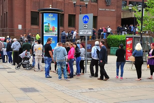 | People Queuing outside Peterborough Magistrates Court Answering Summonses for non payment of council tax. It’s not they won’t pay it is because they CAN’T pay! |