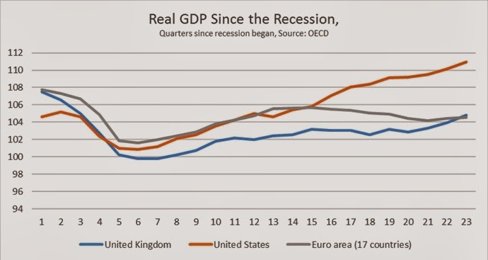 As the British economic crisis becomes more prolonged the outbreak of stupidity that greets every new piece of important economic data becomes more generalised. Previously there has been a campaign to suggest that austerity has led to recovery when the opposite is the case. The recovery is based unsustainably on rising consumption, led by government consumption. The publication of the latest GDP data for most major economies has now led to wild suggestions that Britain is booming and is the strongest major economy in the world.The level of real GDP in Britain since the recession began at the beginning of 2008 is shown in the chart below. It is compared to the US and the Euro Area. British growth has been almost exactly the same as that of the Euro Area as a whole and significantly worse than US GDP growth.