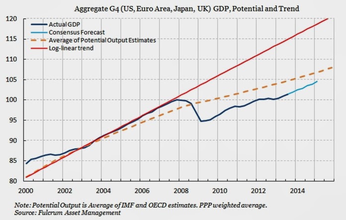 In the chart below Gavyn Davies shows the actual level of GDP in four economies combined (US, Euro Area, Japan and Britain) are shown along with the consensus forecasts for growth (the blue lines). The trend growth rate of those economies is shown the red line. The dotted yellow line shows the average estimate of potential output.