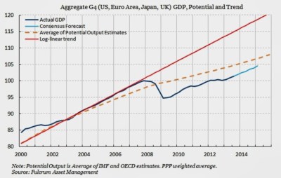 The red line represents previous level of growth whereas the dotted yellow line represents the average of estimate of what is now possible for growth. In both cases, actual and forecast GDP is set to remain below those levels for some time. But much slower growth projected by the depressed level of estimated potential output shows that the dominant idea is something close to ‘secular stagnation’ for the leading industrialised economies, something like 1.2% growth per year.
