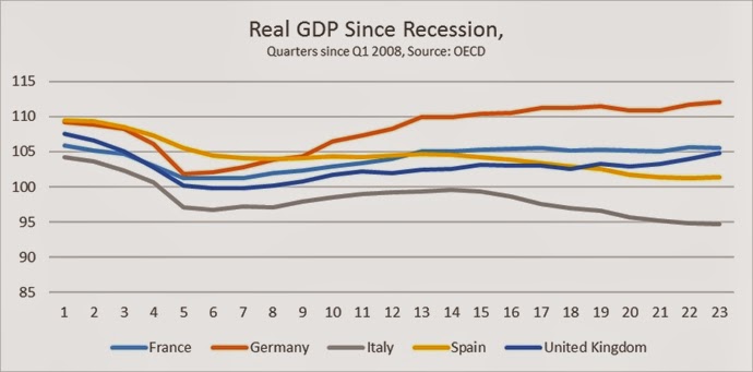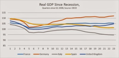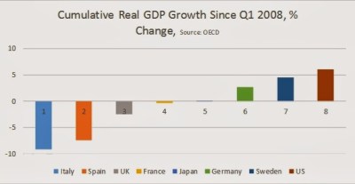 Outside the Euro Area the British economy is free to set its own monetary policy and to devalue the currency. Via Quantiative Easing and a large fall in the pound it has taken advantage of both of those yet its growth is no better than the average of the Euro Area and is markedly worse than both France and Germany. British growth is also markedly worse than that of Sweden, the next largest EU economy outside the Euro Area.