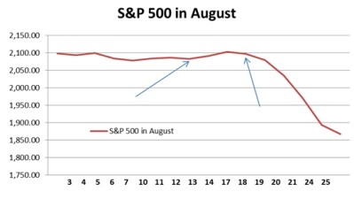 On August 19, the Federal Open Markets Committee (FOMC) of the US central bank released the minutes of its most recent meeting (second arrow), which was widely interpreted as indicating a strong likelihood that interest rates would be increased in September. The prior closing level for the S&P500 was 2,097 and it fell sharply thereafter. Following speeches by a number of governors of the US Federal reserve (who vote on the FOMC) questioned the need for an increase in rates, and the market has recovered in response. Yet other speeches pointing once more to a rate rise led to stock market falls once more, and so on.